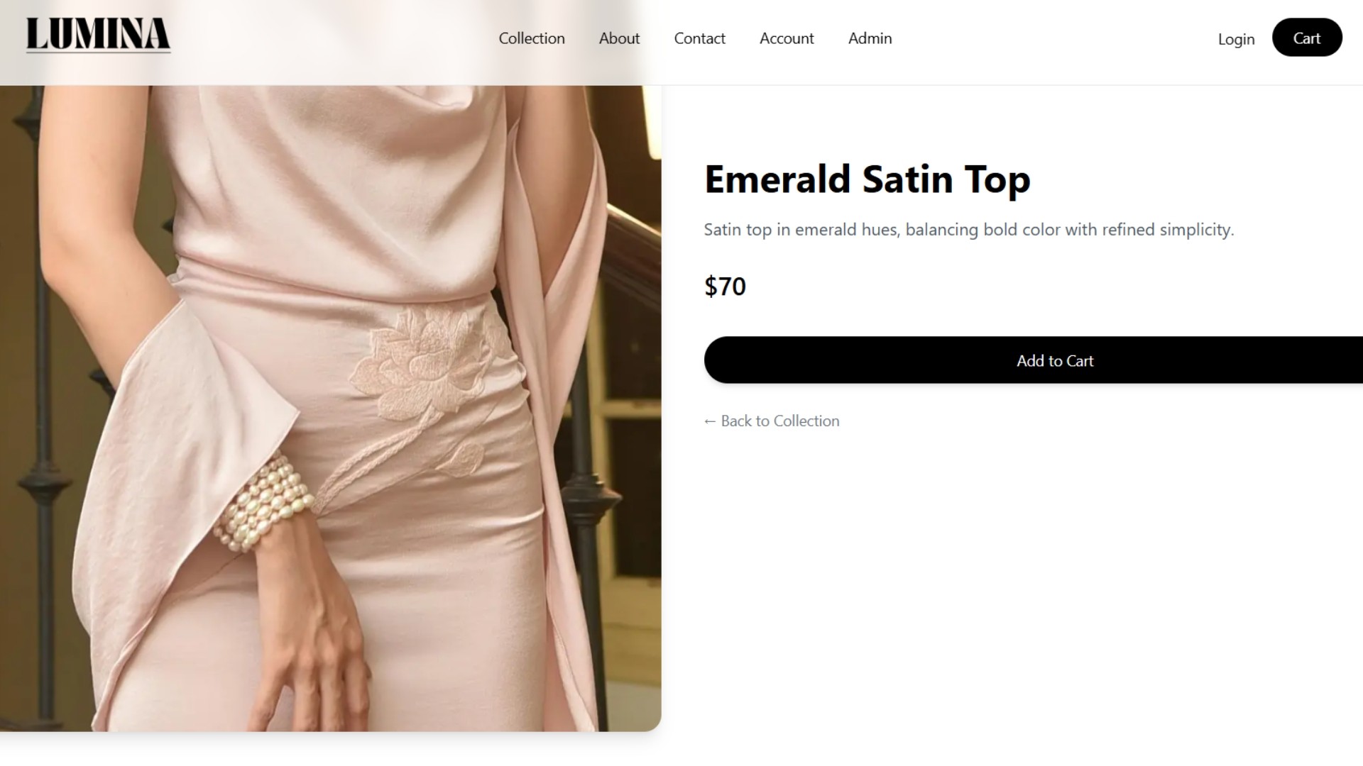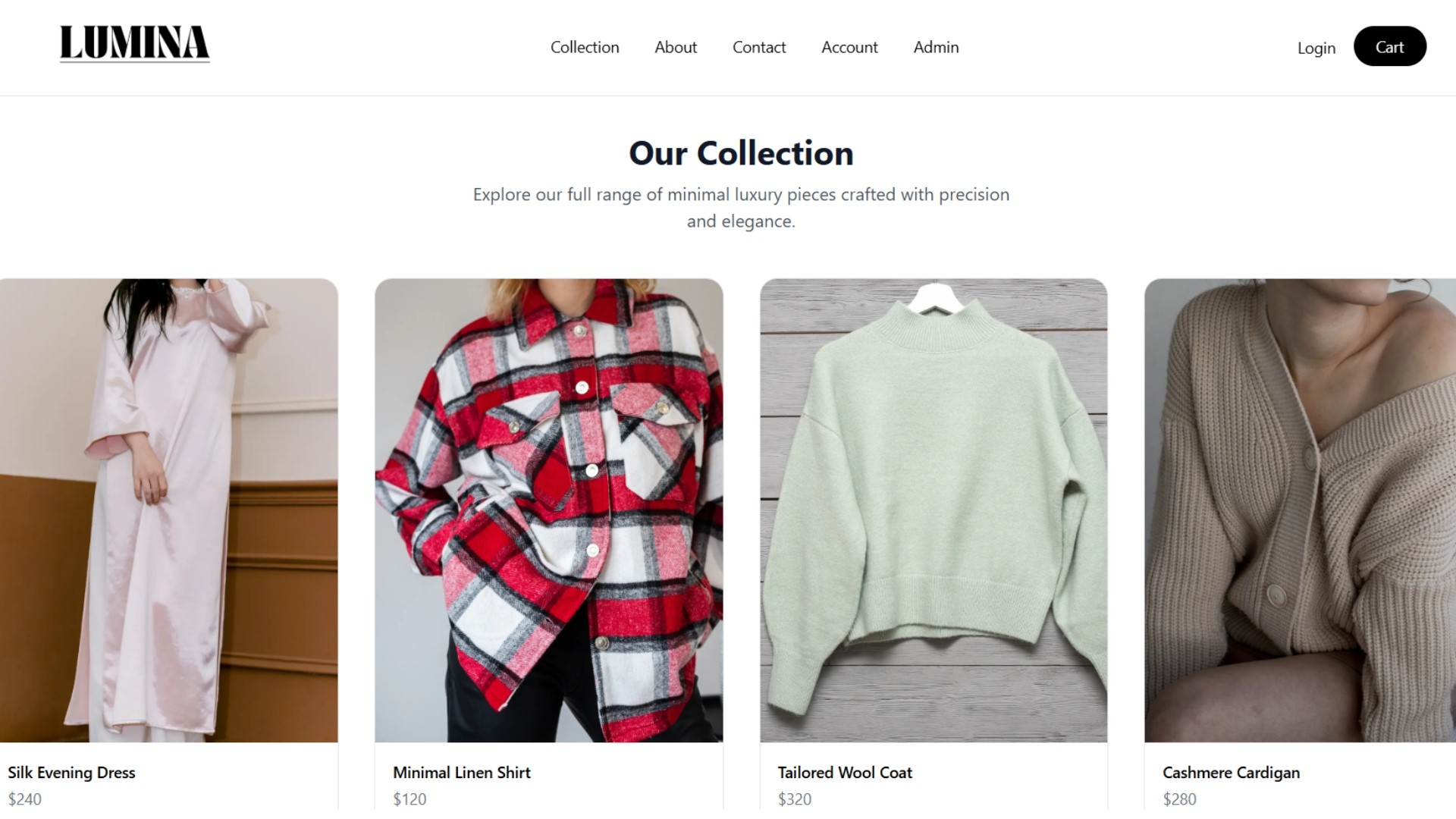 Lumina is a luxury fashion startup concept that required a clean, modern, and high-performing e-commerce MVP.